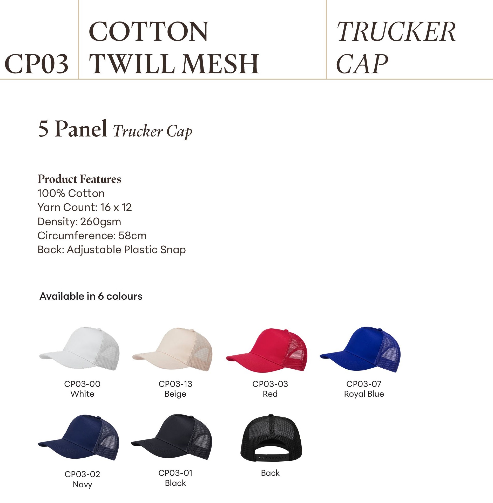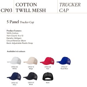 Product Features 100% Cotton Yarn Count: 16 x 12 Density: 260gsm Circumference: 58cm Back: Adjustable Plastic Snap